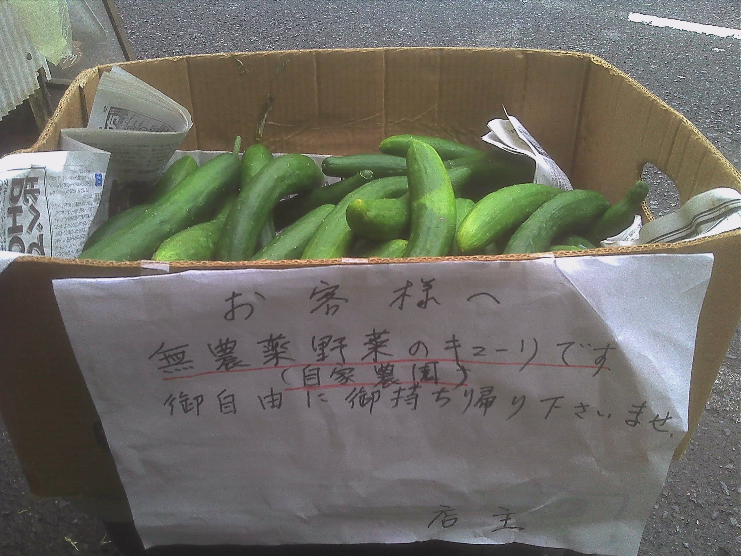 じめじめした日 2012年6月30日 が続きますが今日で6月も終わりですf(^ー^; 今日は入口に自家製農園で取れた無農薬のきゅうりをおいてます。 御来店いただいたお客様に無料で配ってますd=(^o^)=b 霧島市国分居酒屋若大将 45-2308