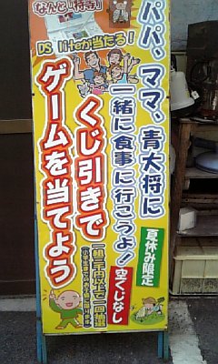 夏休み限定企画 2010年7月26日 夏休み、8月いっぱいまで楽しいイベント開始致しました(^_^;)(小学生以下のお子様)を含むご家族様に三千円以上ご利用あったら小学生以下のお子様の人数分くじ引きのチャンスです。特賞はニンテンドーDSです。是非たくさんのご家族様のご来店心よりお待ちしております(^0^)/