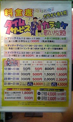 カラオケ青大将 2010年4月1日 本日よりカラオケ料金が変わりました(^0^)/ 好評中の食事タイムは、ディナータイムと名前が変わりまして・・・さらに1時間時間が延びて17時〜22時になりました。22時〜27時までは新しくナイトタイムを設けました。解らない事がありましたら、お電話・・・もしくは従業員までお尋ねくださいませm(__)m これからも青大将をよろしくお願いしますo(^-^)o