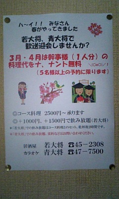 歓送迎会 2010年3月6日 今年も早いもので、歓送迎会の時期がやってまいりました。3月、4月は、5名様以上でコース料理を頼まれましたら・・・ナ・ナント・(@_@)幹事様(お一人様分)の料理代を無料に致します(ノ><)ノ 是非、お越しくださいませm(__)m