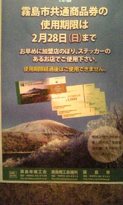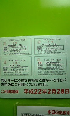 サービス券、及び霧島市商品券 2010年2月28日 忘年会でコース料理を食べられて抽選券を持っていらっしゃる方、及び、霧島市の商品券をお持ちの方は本日までの有効期限となっております。お持ちの方は是非お越しくださいませ(^0^)/従業員一同お待ちしております。