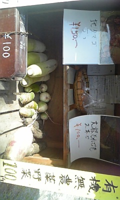 無人販売所オープン 2010年2月16日 雨が続いて予定がズレまして、本日オープンしましたf^_^;青首大根、黒大根、紅心大根、ビタミン大根、など・・・よりどり2本、組み合わせて100円となっております。地卵は5個で150円となっております(^0^)/是非お買い求めくださいませo(^-^)o無農薬なので安心、安全です。どう料理したらおいしく食べられるか調理方法及び、レシピも張り付けておりますので、そちらも是非ご覧になって下さいm(._.)m