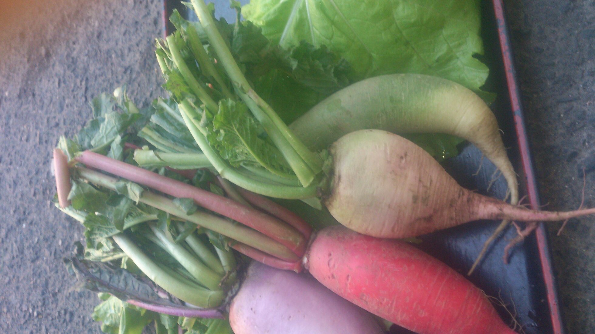 自家農園便り 2013年11月9日 皆様こんにちは(^-^) 今日は中吉農園で採れた野菜をアップしました。 赤大根やコウシン大根、ビタミン大根等珍しい大根や。水菜や白菜もできました\(^_^)/ 無農薬栽培だから新鮮で美味しいですよ! 是非この機会に若大将グループへ足を運んでみてください。