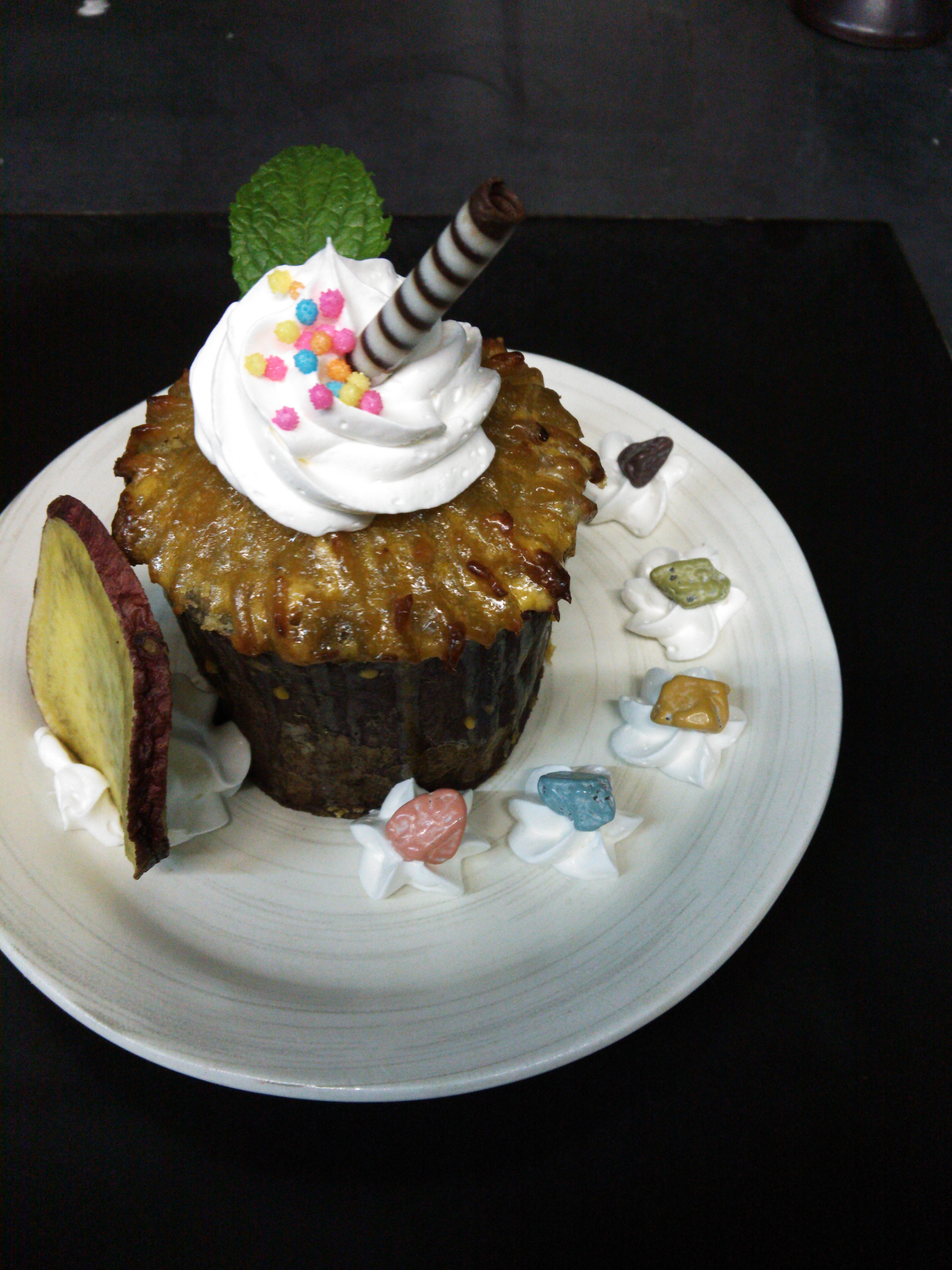 桜島スイートポテト 2013年5月25日 こんにちは(^o^)/ 新しい手作りデザートの紹介です(-。-)y-~ 自家農園のさつま芋を蒸し焼きにして 立てて桜島にみたてて、 生クリームは煙、皮に垂れてる卵黄は溶岩、 周りにあるストーンチョコは噴石を イメージしました(^o^ゞ 350円です 是非一度食べに来て下さい(^o^)/