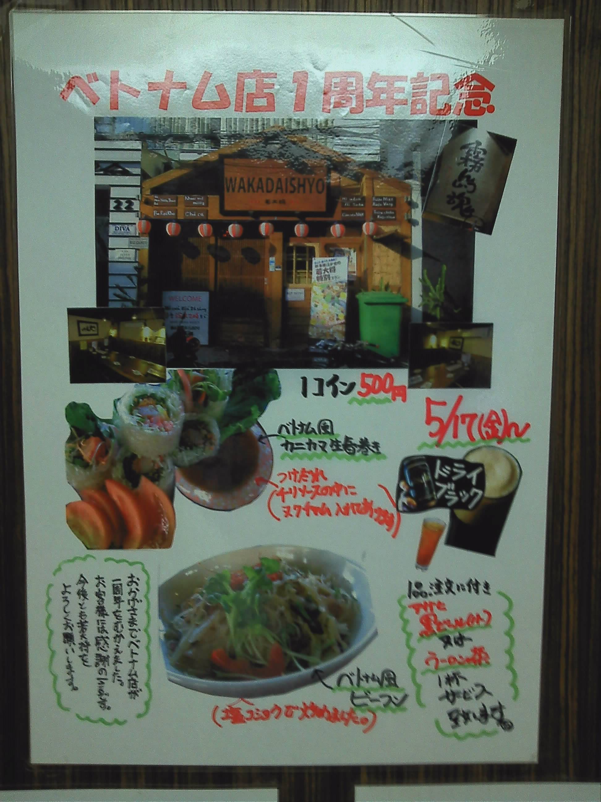 ベトナム店一周年記念 2013年5月17日 おかげさまで今日、5月17日で 若大将ベトナム店が一周年を迎えました\(^o^)/ 今月末までの間、 ビーフンとカニカマ生春巻きと 2種類ワンコイン(500円)で やります 一品たのむと ウーロン茶か黒ビールの小を 一杯サービス致します(>_<)