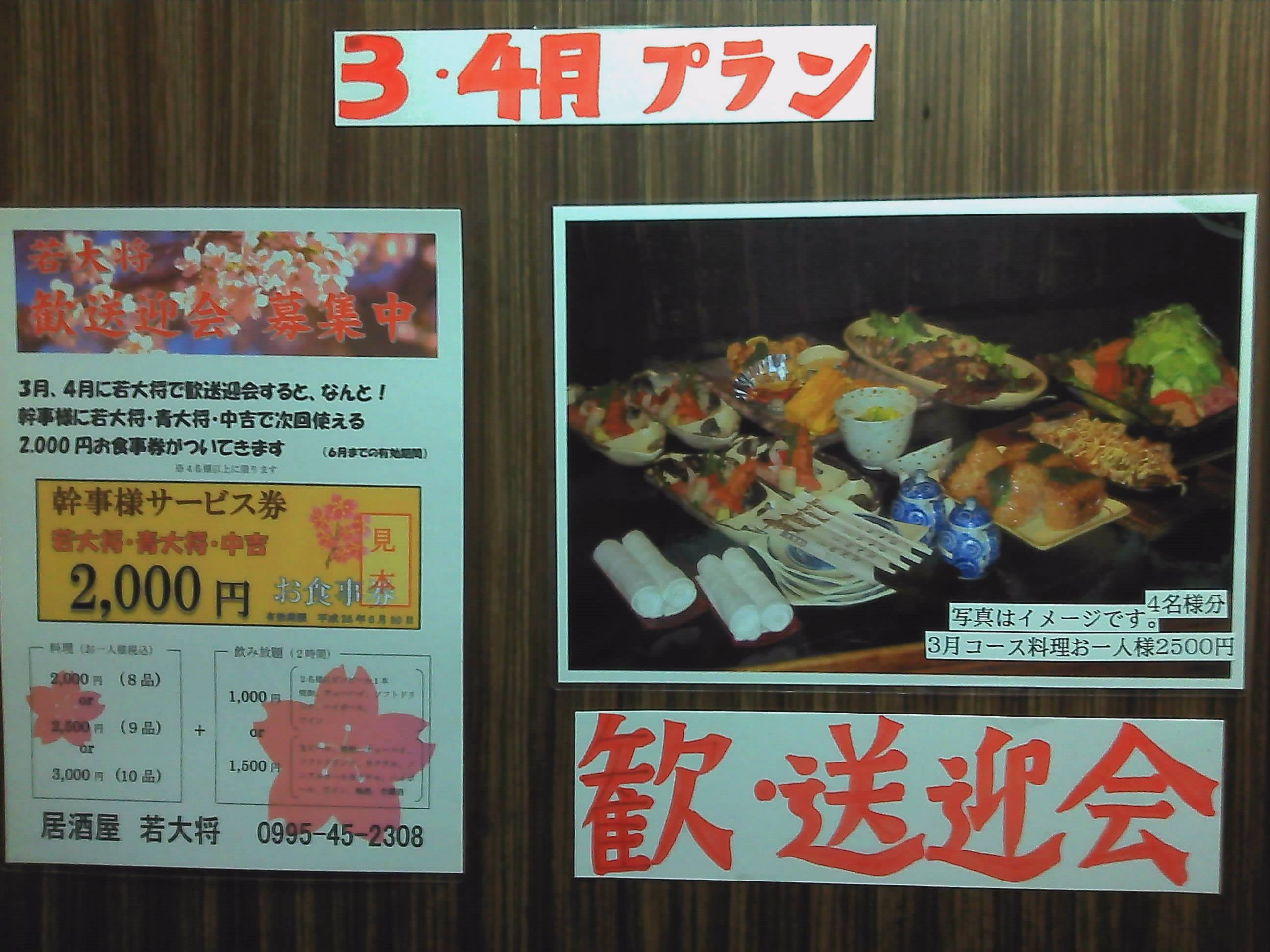 歓送迎会 2013年3月3日 こんにちわ\(^o^)/ 今年も、もう3月なりましたね(^-^;若大将で3月4月にコースで御予約すると・・・(4名様以上で) 幹事様に次回使える2000円の食事券をプレゼント中です(^o^)/ 是非この機会にいらして下さい。