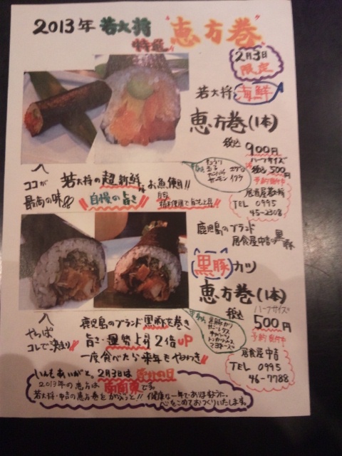2013年若大将の恵方巻き 2013年1月10日 今年もやります(^o^)/ 今年は南南東に向かって丸かぶり(^^;) 若大将特選海鮮巻きはハーフが 500円と一本が900円 中吉の黒豚カツ巻きが ハーフで500円の二種類です (>_<) 皆様のご健康と、幸せを願って心を込めて作ります。 予約受け付け中ですので 是非御予約下さいませm(__)m 電話 0995-45-2308